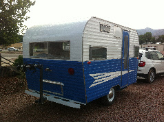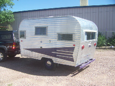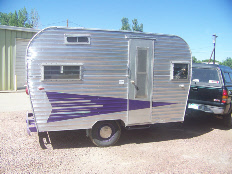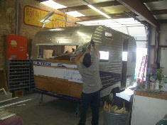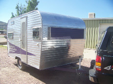 After the skin was installed we began working with a paint scheme to satisfy the clients taste by taping designs and messaging photos to her in CA. Staying with the Roadrunner arrow we modified it to a smaller size (compare to the original in top photo). The front of the trailer retained the trademark Roadrunner polished quilting next to the window and the lower rock guard.