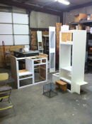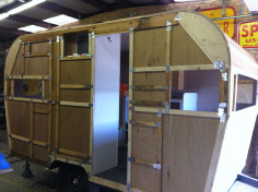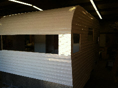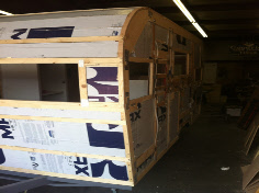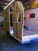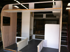 We rebuilt the walls correctly with birch paneling and a whitewash finish the client wanted. We custom built the cabinetry which we finished in white before installation. The new floor decking was covered with a gray Marmolium before the cabinets were installed. Not our usual style of interior but it’s really looking nice. Once all the cabinets were installed we closed in the rest of the body... It’s now ready for wiring and insulation.