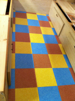 As part of the makeover we did replace the boring vinyl flooring with this colorful checkerboard floor.