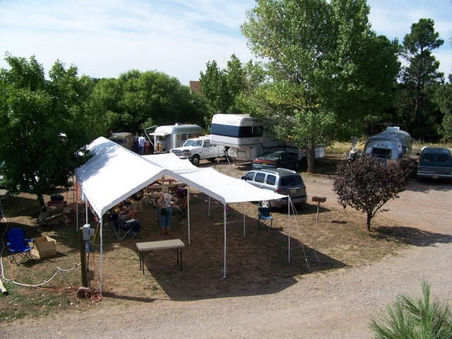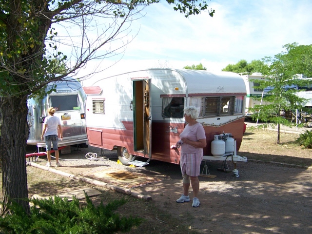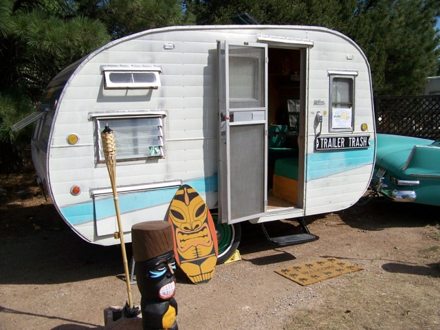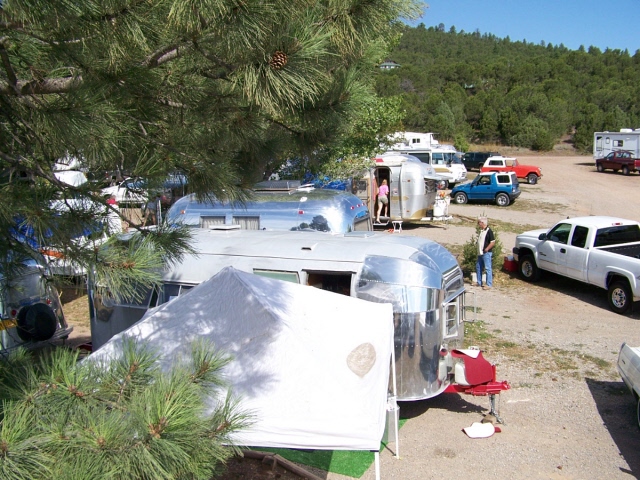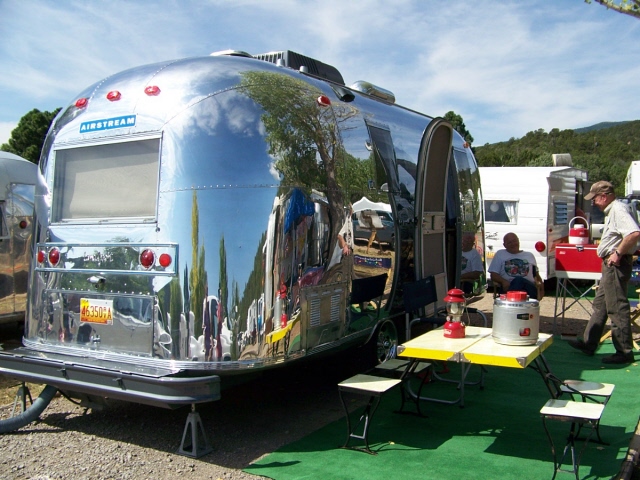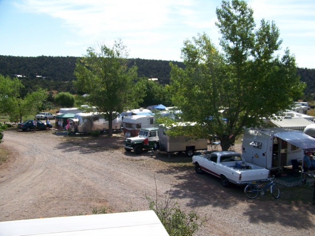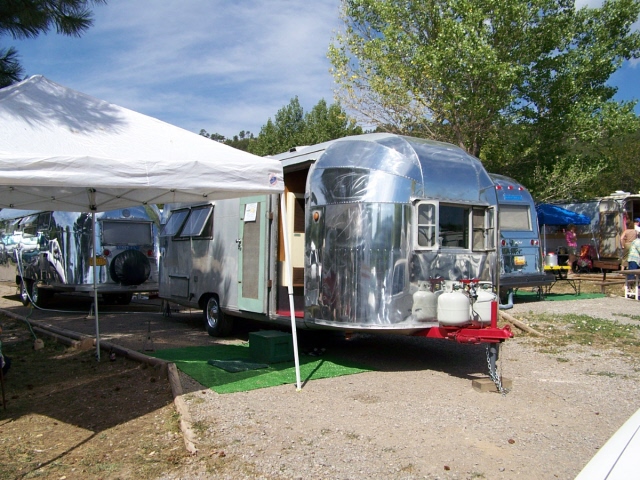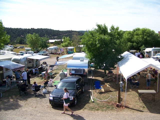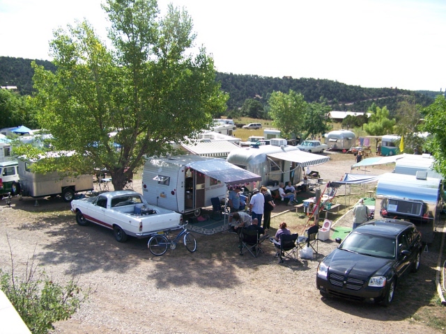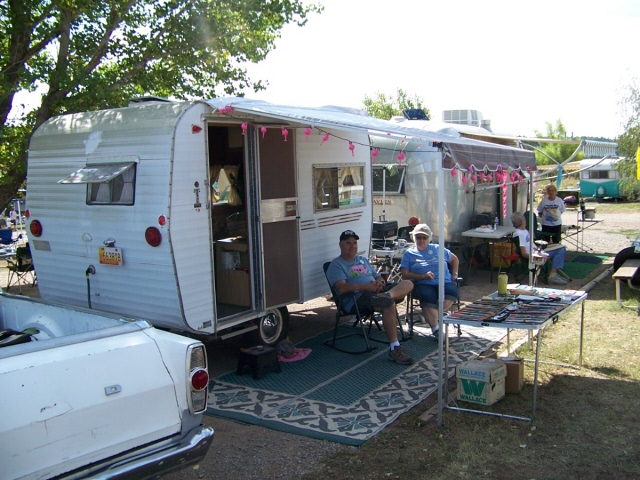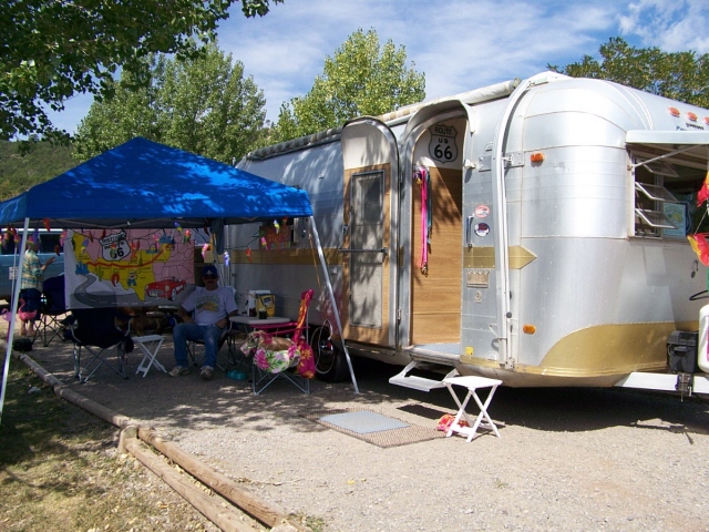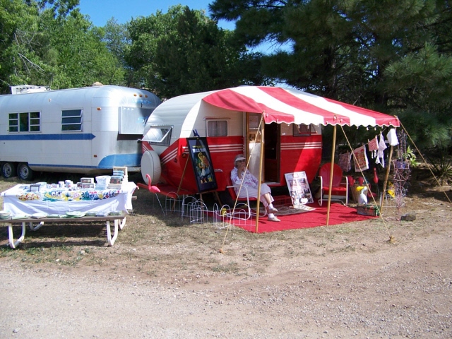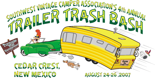 The fourth annual Trailer Trash Bash was another great event, with close to 50 vintage campers enjoying the New Mexico mountains and some great weather. We had many more trailers than we had spaces, but everyone cooperated as we doubled up most spaces and parked others wherever we could squeeze them in. Overall, I think it provided us with a very fun atmosphere. We started out Friday night with our "Drive In Movie", this year we showed a segment of "Cars on Route 66", a document featuring the Southwest Vintage Camper Association (available from Netflix). We followed that with our feature film, "Wild Hogs", which was filmed in the area and was very much enjoyed by everybody. Saturday was the usual open house, where everybody got a chance to show off their campers and collections, as well as check out all the others. Many folks brought along some swap meet items, so there was quite a bit of buying, selling & trading of cool stuff. The highlight of the weekend as usual was the party Saturday night. Not only did we have enough good food to feed twice as many people, the Queen contest was great as usual. Several lovely ladies tried out, but the eventual winner was Shelia Howard, AKA "Paris Shasta". Thanks to all the ladies, they all looked great! Sunday morning was the pancake breakfast and the goodbyes. A special THANKS to Deborah, Bradley and the rest of the crew at the Turquoise Trail Campground for supporting us and letting us take over the place for the weekend, as well as thanks to all that put in much time and effort in putting on this event. No way can I write details about everything that went on, but pictures say more than words so enjoy...here are more than 160 pictures! CLICKING on the picture will bring up a larger image, use your browser "back" button to return to the photo pages. Don't go away! Click HERE for more pictures of the TTB4!