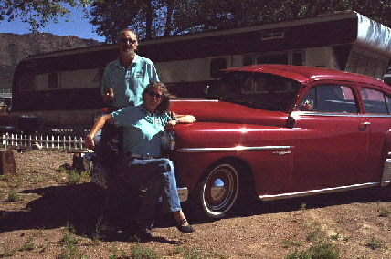 Sylvia and Larry with the Starlite Campground’s 1957 New Moon and classic 1950 Dodge.