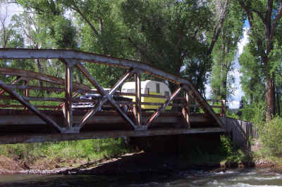 This classic bridge has been relocated from Oklahoma to the Little Creel for some future park expansion. Great photo op with Lannie's 53 Ford - 56 Shasta combination