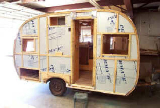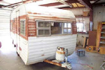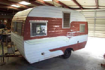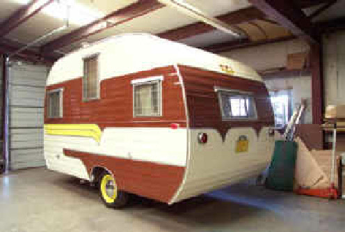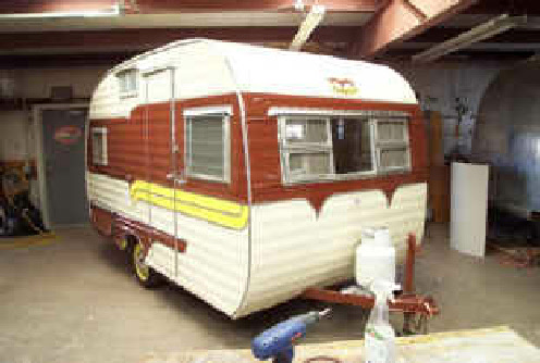 The finished trailer! We matched the original colors and scheme on the outside. We only had to do some fresh shellac on the interior wood to match the new panels, the rest of the interior was amazing for its age. That is the factory original seat covers, table/counter tops and the floor was almost perfect! The owner had really taken care of it over the years.