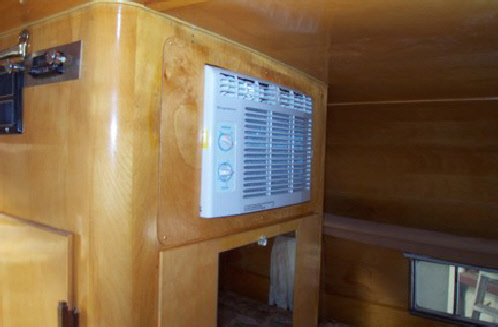 We did add one of our AC units. We shortened the closet door a bit and built a structure above it to support a household AC unit. These have to be installed correctly to work, the venting of these units when mounted inside like this is critical for safety and to function well. It’s not a simple matter of bolting it to a shelf and cutting a hole to vent it outside!