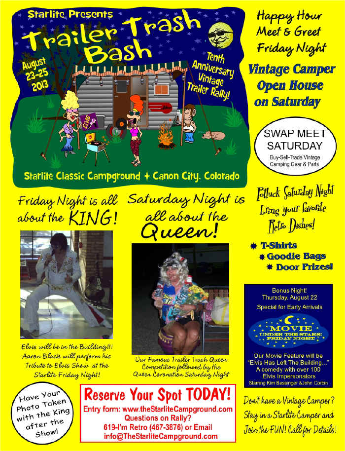 The ONE & ONLY famous TRAILER TRASH BASH, hosted by the Southwest Vintage Camper Association. We promised something special this year to celebrate our tenth anniversary Bash and I think we've done it! As usual this event centers around the Trailer Trash Queen and Saturday night will be all about the Queen, but Friday night it's all about the King! And who better for the King than the King of Rock and Roll? That's right, Elvis will be live at the Starlite on Friday Night. Award winning Aaron Black will be performing his Tribute to Elvis show. This one is a don't miss event! Open house of dozens of vintage campers, swap meet and more. More fun happens on Saturday night with the annual Trailer Trash Queen competition! All ladies are encouraged to enter, use your imagination to dress in your best trailer trash attire. The winner gets the tiara, sash, the royal throne for a year (you have to see it to believe it!), your own camper featured on the 2014 t-shirts and posters, and free entry to the 2014 Bash! As a bonus for early arrivals Thursday night our "drive in movie" will be showing "Elvis has Left the Building" a great comedy starring Kim Bassinger and John Corbin, along with 100+ Elvis impersonators. Entries are limited to pre-1975 campers of all types. Spaces are assigned on a first received basis, so get those entries in as soon as possible for the best spaces, once we sell out of hookup spaces we will be dry camping the rest. Of course if you don't have a vintage camper you can rent one of the Starlite units and still join in all the fun, reserve one today before they are gone!
