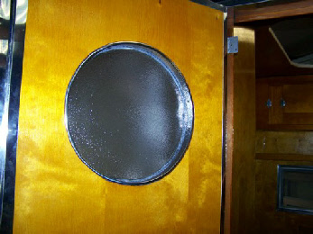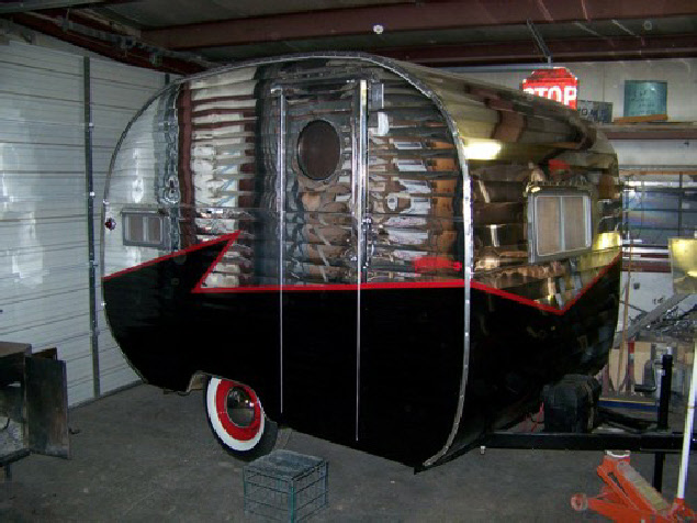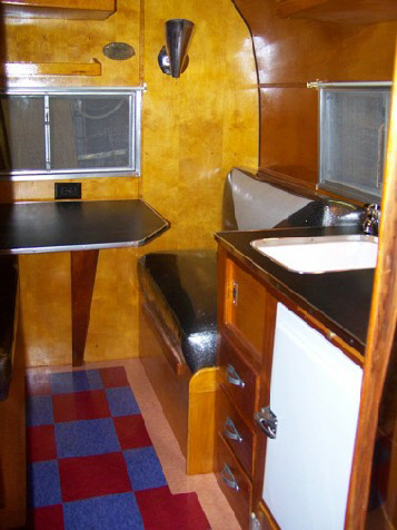 Similar to the hot rod themed Corvette it’s black with polished skin and red trim. The design matches the original Fireball design. New owner picked out the interior colors including the black and silver Zodiac vinyl. She did not want any propane so we eliminated the stove top. We also added a port hole window to the door per her request.