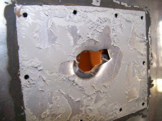 Ever wonder what could be lurking under the skin? We found a strange patch panel on the side, under it we found a bullet hole. Once we took off the skin look what we found... The bullet went right through a 110V wire leaving bare ends up against the aluminum and foil backed insulation. Yikes!