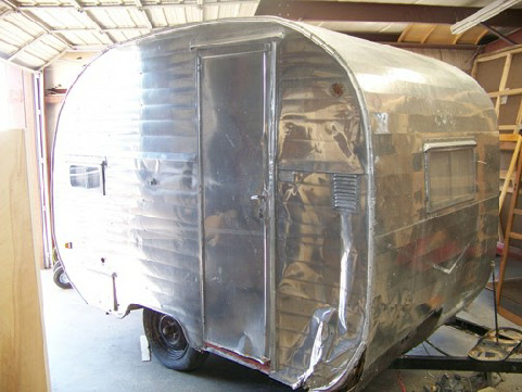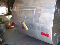 How’s this for cute? It’s only 12’ long. Somebody had tried to polish it (it was a painted trailer from the factory) and then had a little accident crunching the left front corner. Cheap marker lights we used for tail lights, one for tail, the other for turn signal. We did replace them with correct era tail lamps.