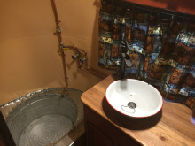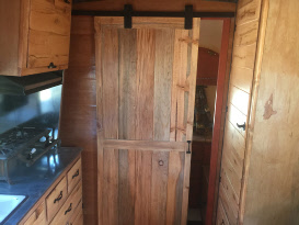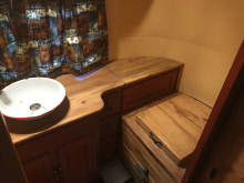 The cabin theme continues into the full bathroom... starting with a custom built "barn door" for privacy. The toilet is hidden under a box, looks like an outhouse toilet but its a brand new Thetford unit. The basin is a repurposed antique wash basin converted into a vessel sink. The shower tub is a galvanized wash tub with vintage look copper plumbing.