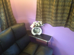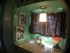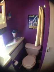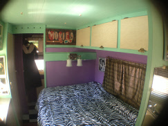 Custom interior with Cherry Wood laminate flooring. Sleeps 4, one full size bed and a click back sofa in the living room. Currently it is decorated in a vintage Hollywood theme, decor can stay with it, but all of it is easily removed. Lots of storage closets and a dresser in the bedroom.