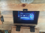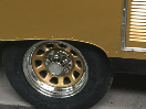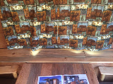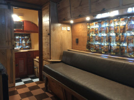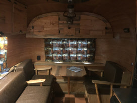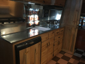 The interior is all custom built to a vintage mountain cabin theme. All custom cabinetry built out of a combo of blue stain (beetle kill) pine and repurposed aspen wood. The walls are really cherry wood veneer. New VCT flooring in the period correct 9" tiles. New Naugahyde upholstery with all new foam and custom built lodge pole arms. The countertop and backsplash are custom made out of galvanized sheet metal. The new flat screen TV is hidden from view on a power lift, as is the built in touch screen entertainment center with CD player, DVD, USB and Bluetooth capabilities.