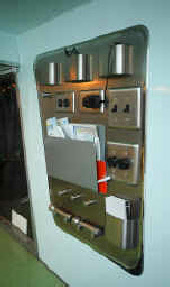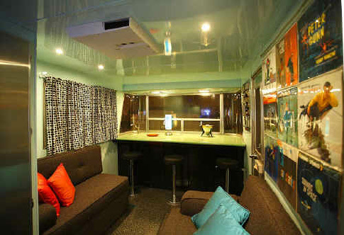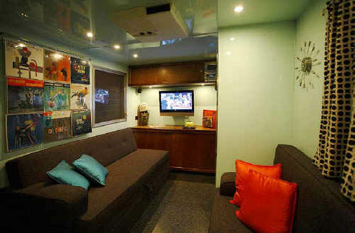 Now the interior matches the modern design of the outside. We added some high tech features... Dimmable LED lighting, full surround sound system, LCD TV, hidden magnetic locking cabinet doors, all controlled at a stainless steel control panel by the front door (think Flash Gorden). The stainless doors are for the closet and full restroom. The sofa is a restored click back that turns into the bed, the flooring is black Marmolium.