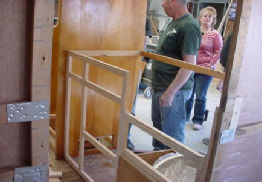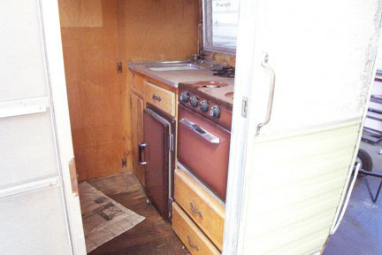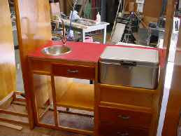 Be began this project by taking the trailer completely apart. We built new walls to accomodate the new custom built windows they wanted, and then custom built the cabinetry to thier design. Going all electric we took out the propane stove and put a microwave in an upper cabinet, added a removable ice chest in place of the ice box, and added an AC unint in the front galley. New custom flooring was laid down and custom made bed benches were built at an angle to give more foot room while standing or sitting at the table. A small restroom was added to the left of the galley.