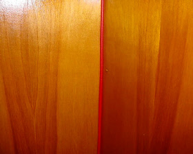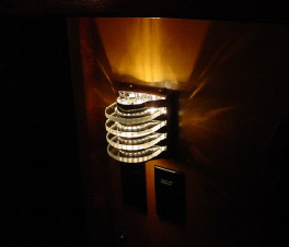 We installed some high tech looking light fixtures, each on thier own dimmer, custom built a table with entertainment center and had new cushions made using black cloth & vinyl with red piping. We used red gimp on all the wood edges to match the design.