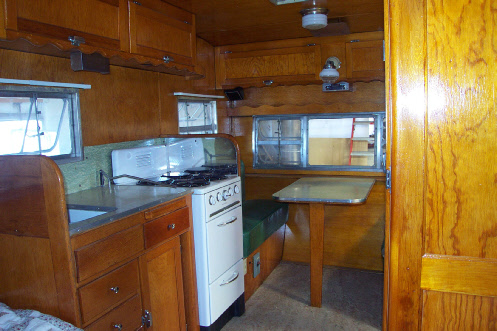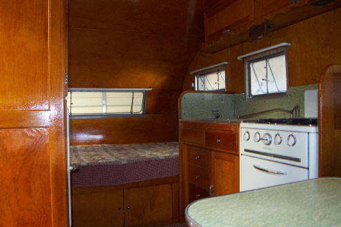 Check out the classic camper interior on this Rod & Reel! Trailers of this era have such beautiful woodwork, the cabinetry is much like fine furniture. Once everything was refinished in amber shellac, the replacement panels matched perfectly.