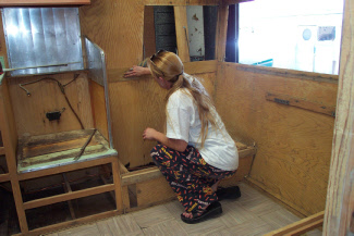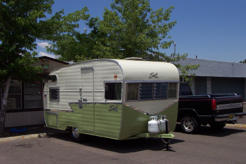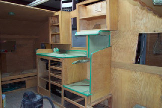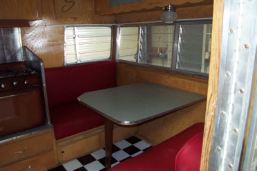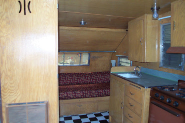 Trailer as it received it’s final details. Outside was painted in a 1956 Ford Thunderbird Sage Green. The interior received new upholstery, new Nevamar laminate on the counter top, table top and the sliding doors. New black & white checkerboard flooring. Look close and you can see the hard bunk we built to replace the original canvas bunk bed over the rear bed. It tilts up out of the way until needed.