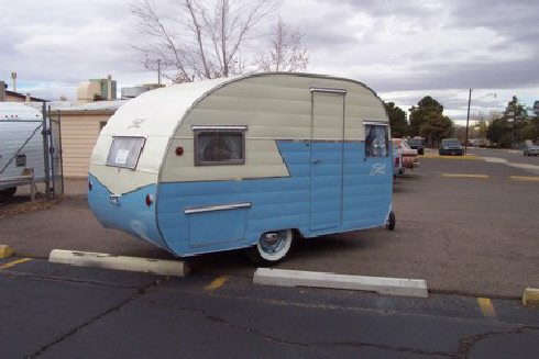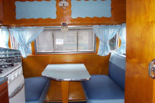 All new exterior, note the new siding has the correct 6” scores. We always use a high quality urethane automotive paint for our restorations, this one in Colonial White and Regatta Blue. All new moldings and the windows restored with all new seals. New tail and marker lights for trouble free towing. Details include one of our new wood screen doors and the classic wide white wall tires with new baby moons & beauty rings. Here it is ready for it’s cross country trip to it’s new home in Arkansas.