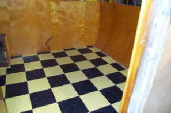 Below, the new cabin is almost back together and we laid a new checkerboard floor with the period correct 9” tiles.