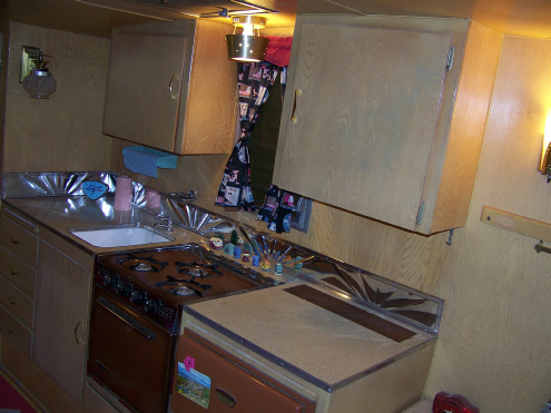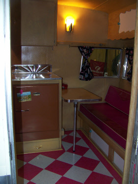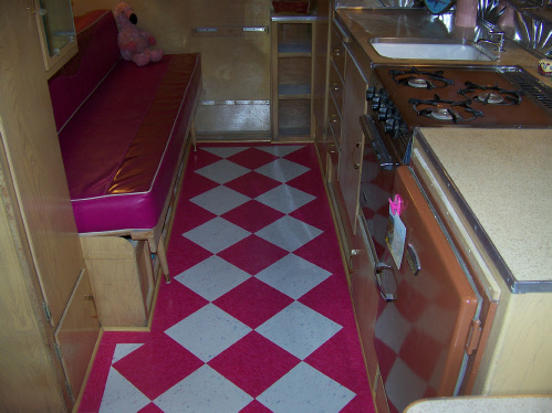 The counter tops are original and in excellent shape., but we did add one of our custom polished aluminum back splashes in a diner style sunburst pattern. We laid down a new floor in a diagonal pattern for fun and had the seats reupholstered in pink Zodiac (glitter) vinyl.