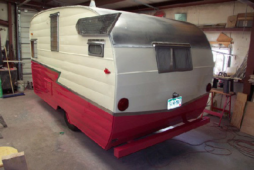 All we did outside is remove the windows, scuff it down good and repainted it in Wimbledon White and 1955 Ford Tropical Rose. Unusual on this trailer which we still don’t have a clue if it’s right or not, when we took it apart we could not find any indication that the roof had ever been painted, even at the factory. We chose to leave it the bare aluminum along with the stripe down the side