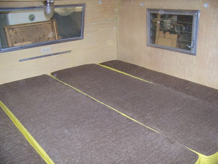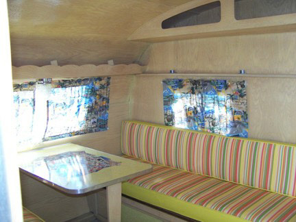 has a stove/oven, icebox and a single sink. The rear of the trailer has two long