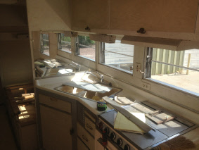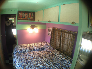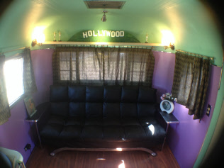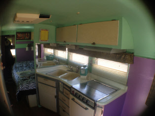 Inside I wanted to add some color to brighten it up. The walls were painted a combo of lavender and mint green, the bathroom painted purple. We left the cabinet doors the original blond wood finish. We also left the molded plastic gold glitter countertops as they were in excellent shape. Streamline trailers are unique as the cabinetry is all aluminum and painted to match the walls, so they were painted to match the new colors. For flooring I laid down a cherrywood laminate floor in the living areas, black & white checkerboard tile floor in the bathroom. We redid all the plumbing in PEX and added a new low flow toilet. We added a new black Naugahyde click back sofa sleeper with custom built end tables.