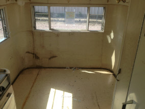 Overall it was in very good shape, everything worked except the plumbing. Interestingly, it was factory built as a park model... no holding tanks, household style toilet, fridge, water heater, etc. Perfect for our use! The outside was nice and straight, just the clear coat had failed and it was dull. Inside though, while in pretty good shape was just blah... everything was tan! Walls, floor, appliances, countertops. I love projects like this, a chance to do a little creative work with color!