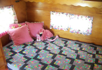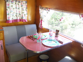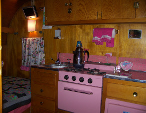 All the interior birch was refinished, the appliances went from ugly brown to pink, new upholstery and flooring and a custom made counter and table tops were added. A custom made Flamingo quilt was added to the bed.