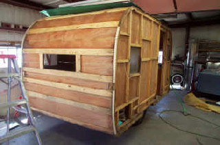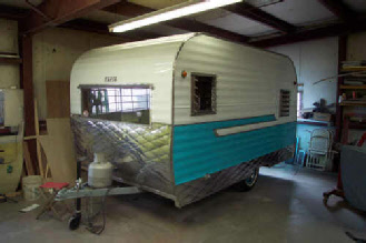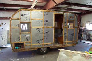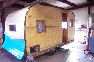 Not really satisfied with t he results of the first time, I decided to reskin the trailer in April, 2005 just nine days before a scheduled trip to a rally in Tombstone, AR. Fortunately the wood structure was in excellent shape with just minor repairs needed. Just in time it had all new skin, including the polished aluminum trim and a new paint job.