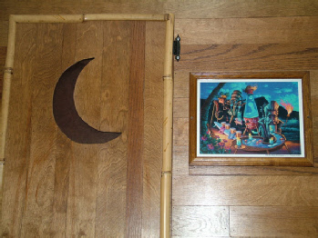 I started out by cutting up all my leftover scrap paneling (birch, ash, oak and luan) into 3” strips and attached it to the walls in random angles, and then stained it all with an oak stain. The different wood grains left the random colors, a look I wanted. I did strip the cabinet doors of the old paint, carved the center of each out and affixed small bamboo reeds behind. I trimmed the edges of the cabinets with real bamboo poles. For the ceiling I used bamboo fencing from a local big box store. Instead of carpeting or vinyl I used astro turf (fake grass) on the flooring. After peeling off the blue contact paper (and the remaining glue) I discovered all the laminate surfaces were in good shape, the original bright yellow, which I kept. I stripped the latex off of the hardware and painted it all with a dark brown hammertone, leaving it with an old aged metal look.