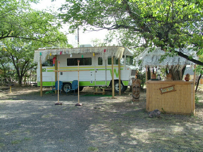 The TikiBago now resides as one of the popular rental units at our Starlite Classic Campground. We parked her next to an awning and it comes with the use of a outdoor Tiki Bar, complete with a hand crank blender for making those Pina Coladas on a hot day. It sleeps up to six, has a full bathroom and comes equipped with all the linens, towels, dishes and cookware... Just bring your clothes, food and drink and enjoy!