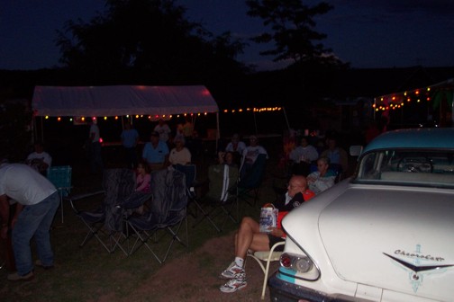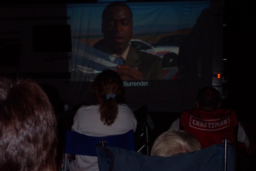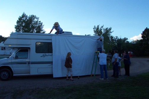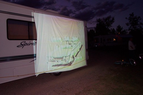 Once again this year we had our Friday Night Drive In Movie. Due to a last minute cancellation by our planned movie setup we had to scramble and set up our own screen. At least new motor homes are good for some things.