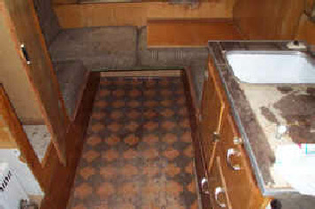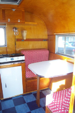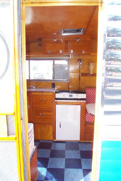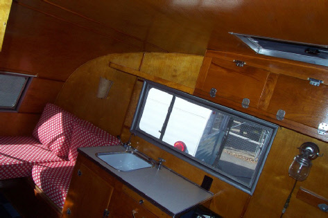 With a combo of polished and painted skin and the new cabin with the original cabinets refinished it’s looking good. We used a Marmolium floor, new upholstery and restored the stovetop and icebox.